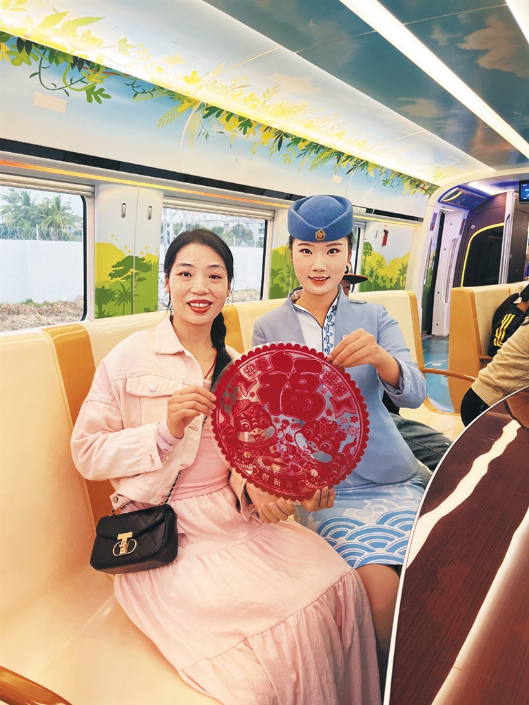 日前,海口车务段在三乐旅游铁路列车上,开展送“福”进车厢活动。