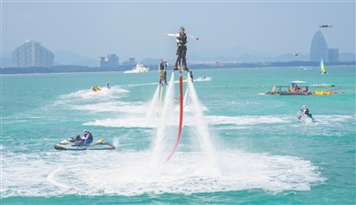 ① 1月19日,游客在三亚蜈支洲岛体验海天飞龙等水上项目。