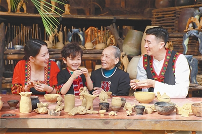 近日,在海南槟榔谷黎苗文化旅游区,一位黎族阿婆带着亲子家庭体验黎族传统制陶技艺。 海南日报全媒体记者 王程龙 通讯员 潘达强 摄