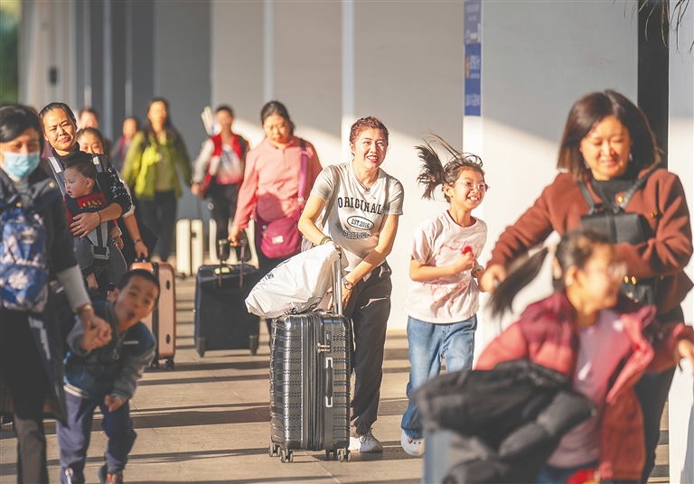 图为进岛旅客到达列车终点站海口火车站时喜笑颜开。