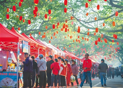 在大路镇集市,琼海人把“新鲜”铺满,时令新鲜瓜果蔬菜、新出栏的鸡鸭猪鹅,刚捕捞的海鲜,还有对联、年糕、糖果、饼干等各类年货,应有尽有,吃游娱赏购,时时有惊喜。