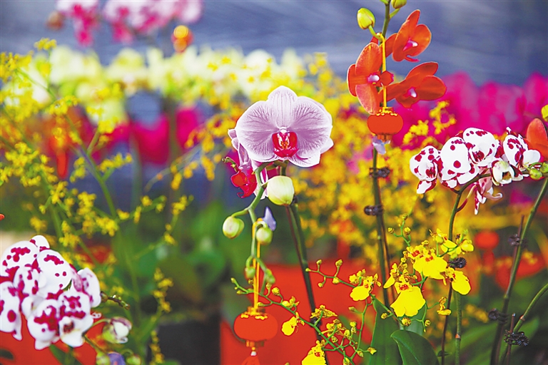鲜红似火的凤梨花、高贵典雅的蝴蝶兰、华美热烈的红掌、绚烂多彩的杜鹃花、“多吉多利”的年桔……各大小花市中,不同种类的年宵花团团簇簇、争奇斗艳。在一片姹紫嫣红中,在阵阵芬芳馥郁中,人们笑语盈盈,喜迎新春的到来。