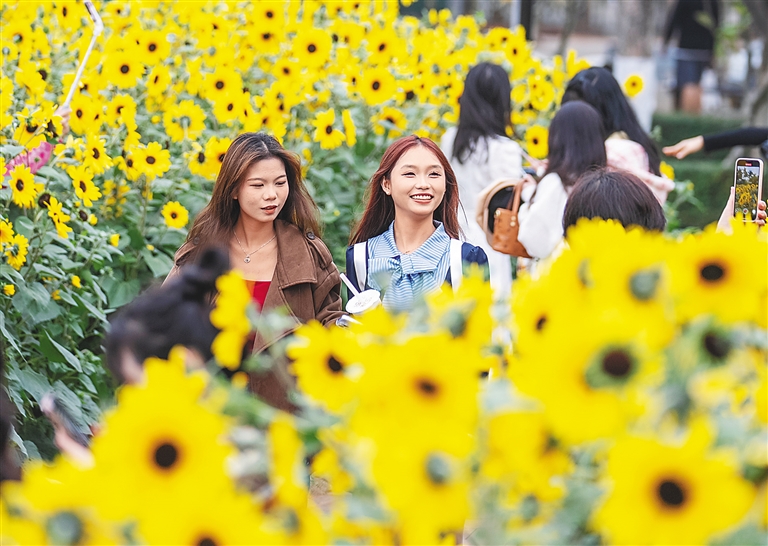 ③ 海口万绿园的向日葵迎来盛花期,游客在花丛中笑容满面。