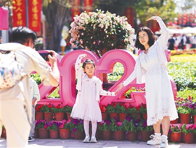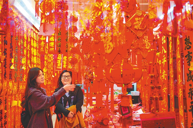 ⑦ 三亚南山文化旅游区年味十足,游客在景区内拍照,乐享暖冬。