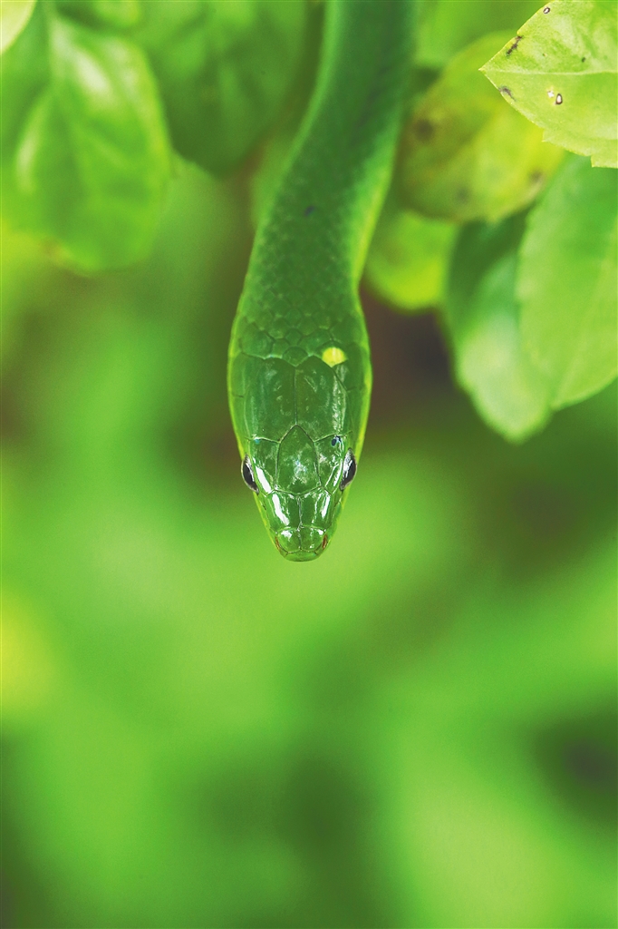 很多人初次“邂逅”翠青蛇,会误以为它是令人胆寒的竹叶青蛇。实际上,翠青蛇是一种无毒蛇,通体如翡翠般碧绿,缠绕在树枝上犹如风度翩翩的“绿精灵”。它们大多胆小谨慎,被一些蛇类爱好者当作宠物饲养。