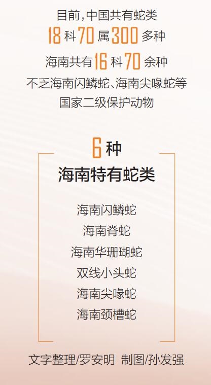 “目前,海南的特有蛇类物种共有6种,包括海南闪鳞蛇、海南脊蛇、海南华珊瑚蛇、双线小头蛇、海南尖喙蛇及海南颈槽蛇。”翟晓飞介绍。