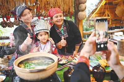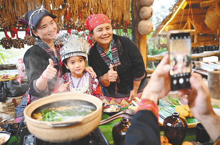 ① 1月28日,位于保亭黎族苗族自治县的槟榔谷文化旅游区,身着民族服饰的游客品尝当地特色年夜饭,并与黎族村民(右一)合影。新华社记者 蒲晓旭 摄