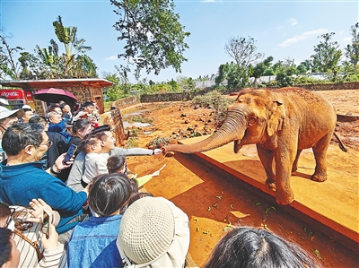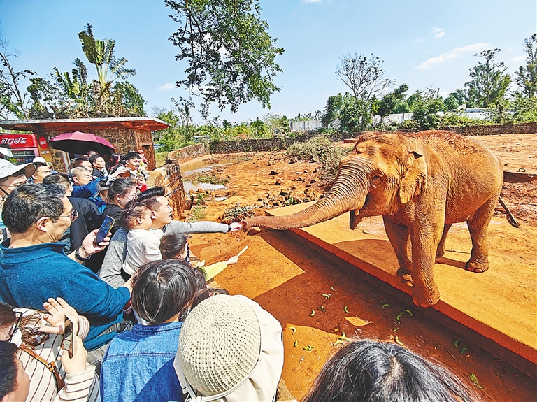 ③ 1月29日,游客在海南热带野生动植物园与动物亲密接触。