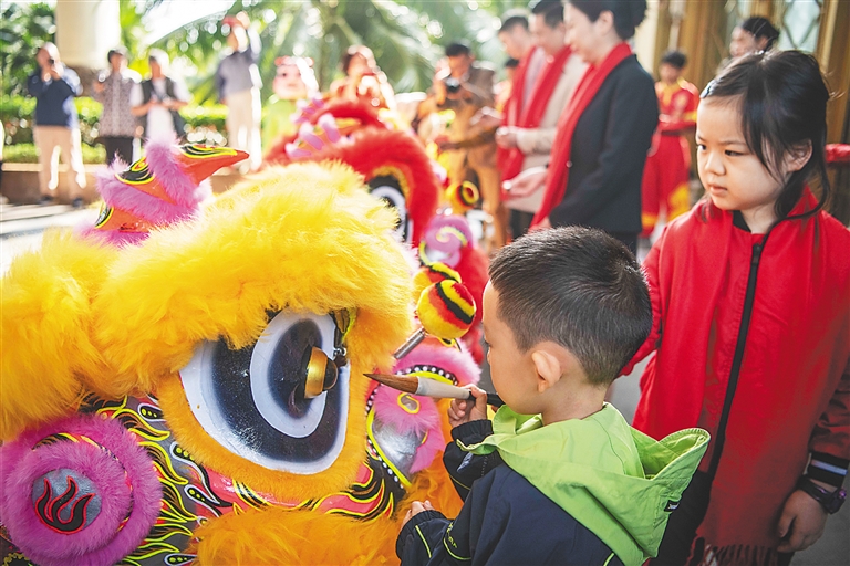 ② 1月29日,在琼海市博鳌东屿岛,一位小朋友为醒狮点睛。