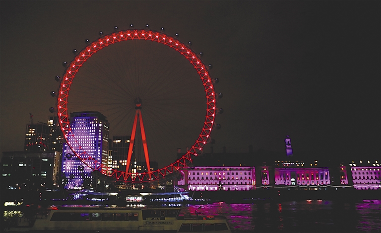 在28日中国农历新年除夕夜,英国伦敦地标巨型摩天轮“伦敦眼”亮起红色和金色灯光,庆祝蛇年新春。当晚,“伦敦眼”前方空地上还举行了精彩的舞龙、舞狮表演,现场锣鼓喧天,年味浓厚。