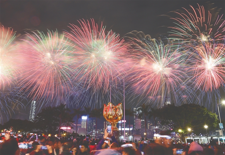 1月30日,烟花在香港维多利亚港上空绽放,游客与香港市民共同欢庆新春佳节。