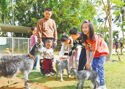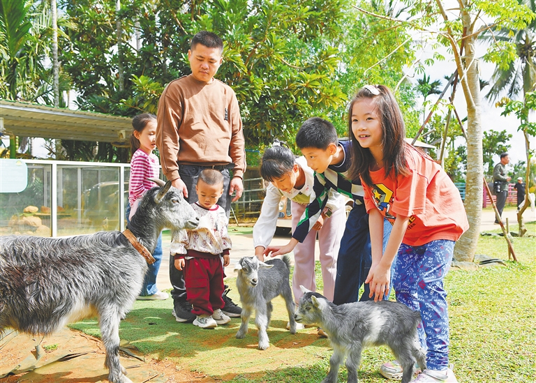 2月2日,游客在琼海市“世界热带水果之窗”游玩,了解热带水果知识,与小动物亲密互动。