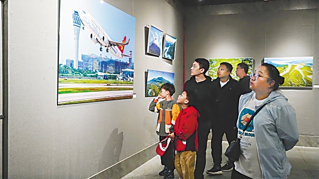 游客在儋州市美术馆内欣赏名家绘画及摄影作品。