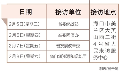 2月5日至8日,省委统战部、省委网信办、省发展改革委、省自然资源和规划厅相关负责人将在海口市美兰区大英山西二街4号省人民来访服务中心接访群众。
