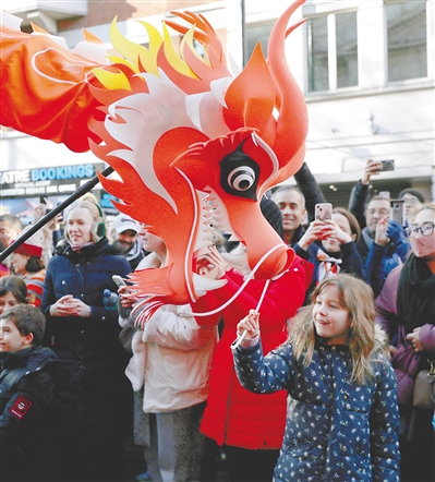 俄罗斯圣彼得堡冬宫桥、美国纽约帝国大厦等多国地标性建筑纷纷亮起“中国红”;在阿根廷布宜诺斯艾利斯,金色舞龙翻腾跃动,民众挤满街道,争相触碰“龙尾”;联合国邮政管理局发行蛇年生肖个性化邮票版张……四海同春,五洲同乐,各国人民共享中国年味。