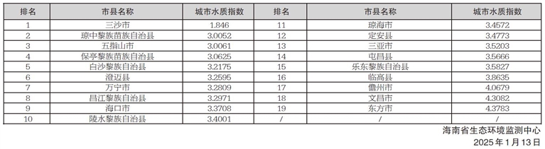 19个市县水环境质量按由好至差排名分别为:三沙市、琼中黎族苗族自治县、五指山市、保亭黎族苗族自治县、白沙黎族自治县、澄迈县、万宁市、昌江黎族自治县、海口市、陵水黎族自治县、琼海市、定安县、三亚市、屯昌县、乐东黎族自治县、临高县、儋州市、文昌市和东方市。详见右表:
