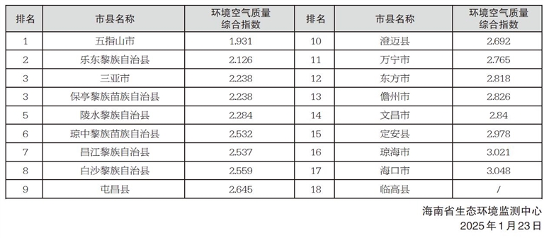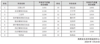 环境空气质量排名靠前的市县分别是五指山市、乐东黎族自治县、三亚市和保亭黎族苗族自治县,排名靠后的市县分别是海口市、琼海市和定安县。受台风“摩羯”影响临高县站房损坏,12月各项污染物有效天不足,不参与排名统计,全省17个市县环境空气质量排名如右: