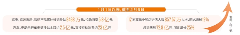 “免税+文旅”融合互动,“吸睛”又“吸金”。海口、三亚等地发放政府消费券,激发离岛免税市场活力;在重点演唱会期间,配发专属优惠券,推出专车接送往返免税店等各项服务;海口国际免税城推出国风巡游等活动,三亚国际免税城为消费者带来火壶等非遗互动表演……今年1月1日以来,截至2月6日,海南12家离岛免税店进店人数857.57万人次,同比增长12%;总销售额72.8亿元,同比增长25%。