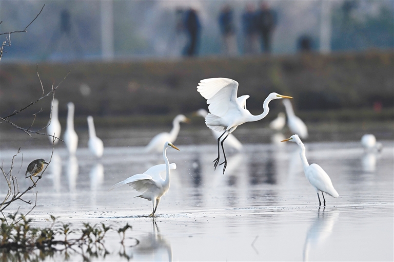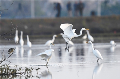 本报讯(海南日报全媒体记者孙慧)2月10日,夕阳余晖下,儋州市儋州湾蒙上了一层朦胧的粉红色。滩涂上,勺嘴鹬伸出勺子样的嘴巴,探入浅水中觅食;几只白鹭排成一行立在树上歇息;手持相机的鸟类爱好者,调好焦距,拍摄下一幅幅水鸟翩翩起飞、水中觅食的美好画面。