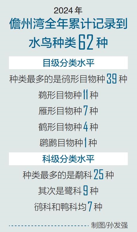 该项目统计数据显示,2024年,儋州湾全年累计记录到水鸟种类62种,隶属5目10科,在目级分类水平上,种类最多的是鸻形目物种39种,其次是鹈形目物种11种,雁形目物种7种、鹤形目物种4种,䴙䴘目物种1种。在科级分类水平上,种类最多的是鹬科25种、其次是鹭科9种、鸻科和鸭科均7种。