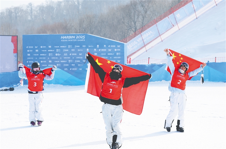 2月12日,在亚布力举行的第九届亚冬会自由式滑雪女子大跳台决赛中,中国选手刘梦婷、韩林杉、杨如意分别获得冠、亚、季军。