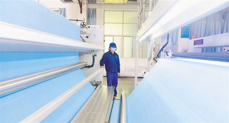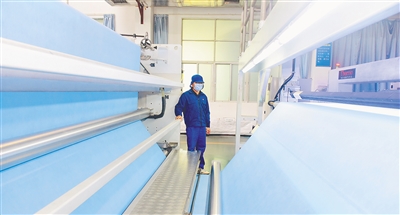 在无纺布分切卷绕环节,机器飞速旋转,发出阵阵呼呼声。技术人员手持检测工具,全神贯注地检查每一台设备的运行状况,一根根细如发丝的纤维片刻之间织造为无纺材料,一个个饱满紧实的无纺布卷就整齐排列在一旁,等待进入后续加工工序。最终它们将变成面膜、卸妆巾、湿巾、卫生巾等等,进入千家万户,服务美好生活。