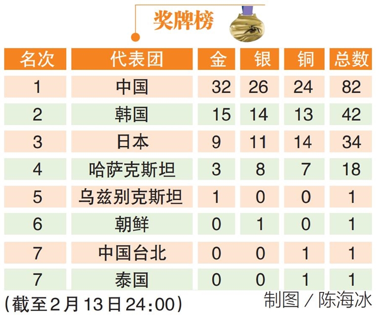 截至13日,中国队以32金26银24铜列奖牌榜首位,韩国队以15金14银13铜排名第二,日本队以9金11银14铜位列第三。