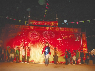 在这块空地上,邓伟忠绑起铁丝、串起彩条、装饰上气球,简单的露天舞台就搭建好了。大年初二晚上,各自排练许久的年轻人带着节目如约而至。邓伟忠从小爱好唱歌,他带来一首费翔的《故乡的云》。