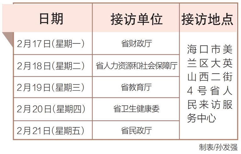 2月17日至21日,省财政厅、省人力资源和社会保障厅、省教育厅、省卫生健康委、省民政厅相关负责人将在海口市美兰区大英山西二街4号省人民来访服务中心接访群众。
