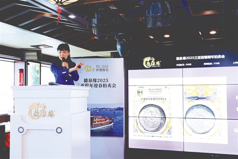 去年12月29日,德辉源拍卖会在三亚CBD举办,总成交额达2533.5万元,成交率高达89%;1月19日,海南东周拍卖公司2025迎新春文物艺术品拍卖会(以下简称艺术品拍卖会)在三亚CBD文物艺术中心举办,现场座无虚席,买家争相竞拍;1月19日,德泉缘2025三亚迎春邮轮钱币跨年拍卖会(以下简称钱币拍卖会)在海上游船举办,收藏家一边欣赏海景一边拍藏品……