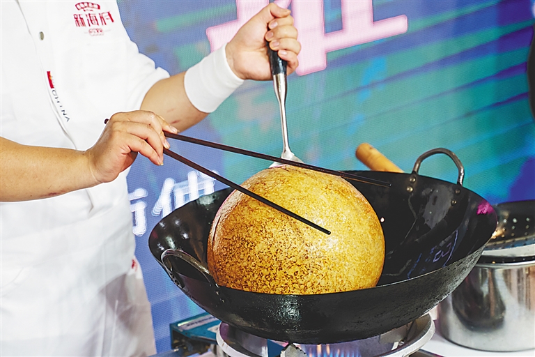 “煎堆制作过程中,煎的过程最能考验一个厨师技术水平。”陈益晨称,因为煎堆最开始就是一团糯米粉,要想将其煎制成球形,就要求厨师在煎炸的过程中,紧盯其形状的变化。糯米球外部受热时,内部就会膨胀,并不断冲破表层。这时候,厨师就要依靠手中筷子和锅铲,将其翻动让里面流动状态的糯米粉迅速填堵破口。就这样不断翻转,直至其表层金黄,直径也达到30厘米以上才算成功完成烹饪过程。再配上特制的餐盘后,呈送到游客们眼前就是一道亮眼的美食。