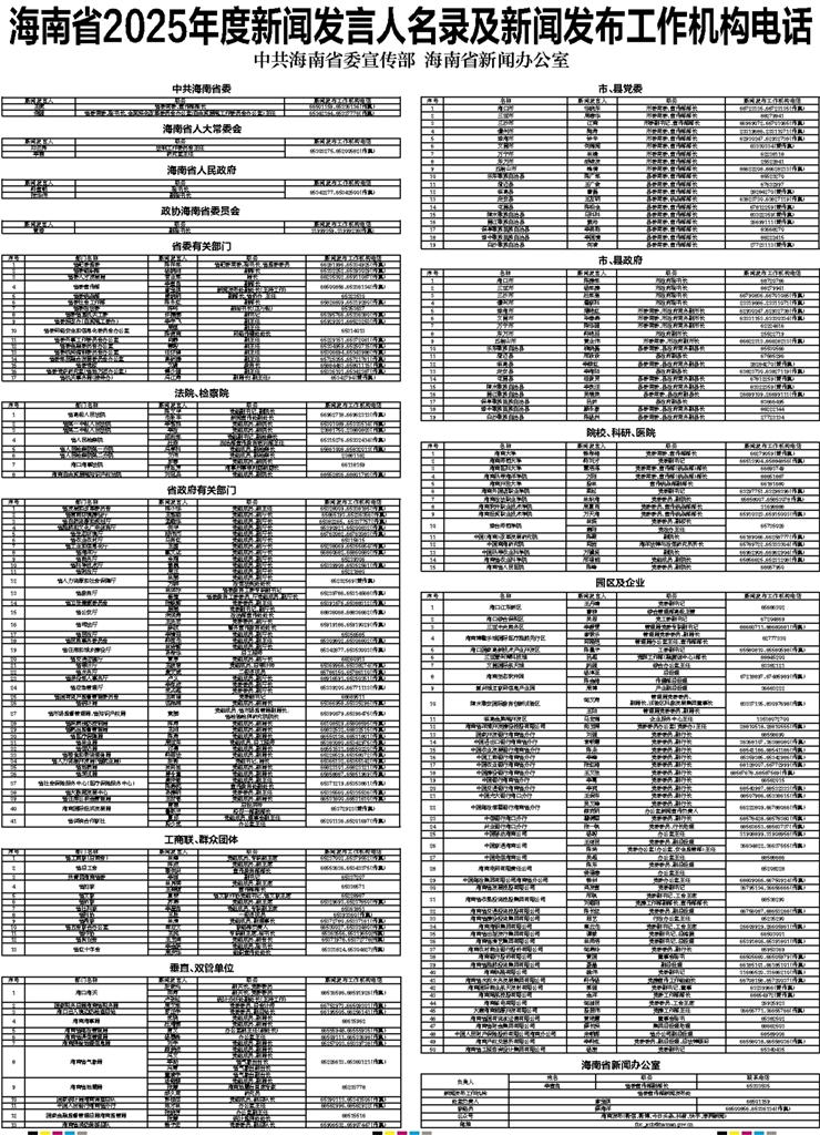 海南省2025年度新闻发言人名录及新闻发布工作机构电话