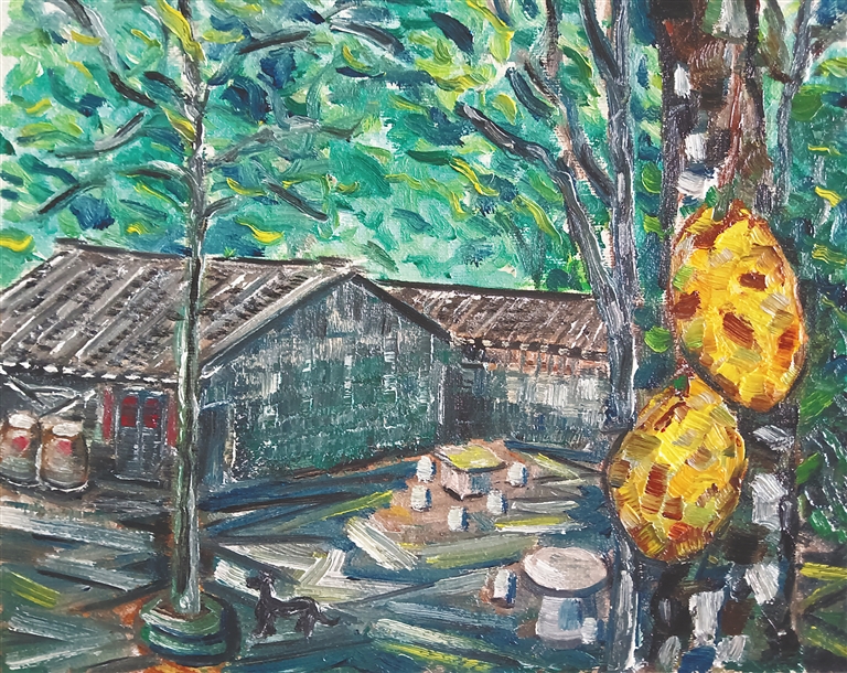 还有《南渡江余晖》《渔村的清晨》《北港岛码头》《农家小院》等,尽管有些是现场写生作品,但却因寄托了这名“小镇青年”独特的情感而变得丰富起来,耐人寻味。