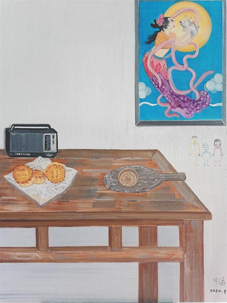比较有代表性的画作是《团圆》。画中场景是大多数人多年前家里古朴的一角,四方木桌上摆着老式录音机和一盘月饼,墙上贴着“嫦娥奔月”的画像。在那个年代,几乎家家户户都是这样的装修风格。