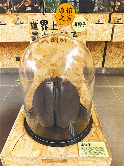 博物馆面积约120平方米,各种各样的植物种子和标本,或摆放在台上,或经过处理后悬挂在墙上。在中间一排展示柜中,一个标注着“镇馆之宝”字样的展品,引起了海南日报全媒体记者的注意。