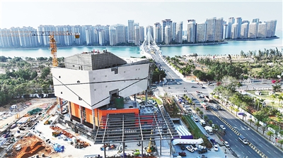 2月24日,在儋州环湾新区邻里中心项目(一期)现场,施工人员正在进行外立面幕墙工程以及室外园林工程等施工。