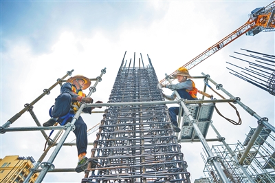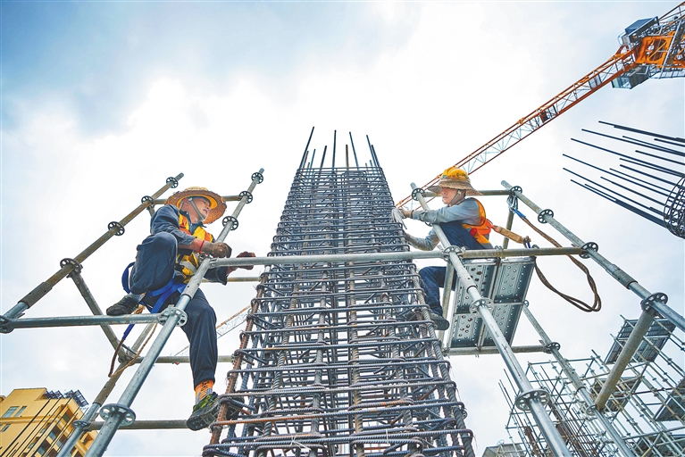 近日,在三亚恒力项目施工现场,工人在捆扎钢筋。目前,该项目办公主楼及裙房三层结构施工已完成。该项目位于三亚中央商务区,是恒力集团打造的综合型区域总部基地。项目建成后,将集金融服务、贸易结算、科技研发等功能于一体。海南日报全媒体记者 王程龙 摄