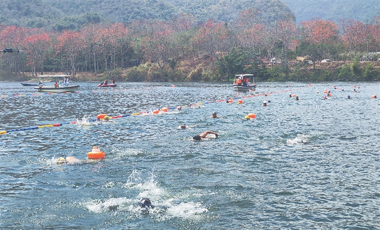 | ② 3月1日,“人在花中游·畅游昌化江”活动在昌江黎族自治县七叉镇尼下村的昌化江畔木棉赏花码头举办,参赛选手上演精彩的水中竞速比拼。 文/海南日报全媒体记者 刘阳秀 图/海报集团全媒体中心记者 鲁启兰 |