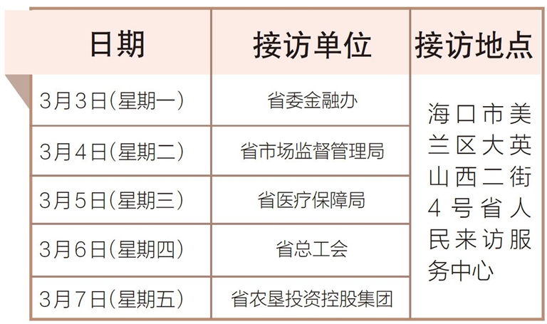 3月3日至7日,省委金融办、省市场监督管理局、省医疗保障局、省总工会、省农垦投资控股集团相关负责人将在海口市美兰区大英山西二街4号省人民来访服务中心接访群众。