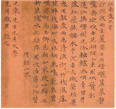 “若到江南赶上春,千万和春住”,此语道出了古人爱春、惜春,对江南春天的向往。元末书法家倪瓒的楷书作品《江南春三首帖》就是他吟咏江南春的诗作。此帖共有三首诗,这三首诗不是律诗,也不是词,平仄不齐,用韵自由。他通过不拘一格的创作手法,用细腻的笔触把春天的花鸟草木、光影烟雾等写了下来,诗句写到惊禽打破杏花的宁静、落花滑过人们的衣巾、柳叶掉入水中化成绿萍,观察细致,视角精微。诗的最后,倪瓒也未按一般思路借景抒情,而是直接把自己置于春日的氛围之中,与自然融为一体,表达了他对春天的体悟和对生命的思考。