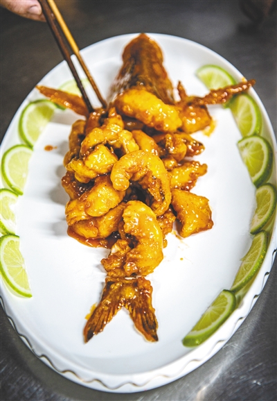 据了解,烹制这道巨无霸百香果鱼的难点在于控制油温。油温掌控好了,才能把鱼肉炸至酥脆度刚刚好。外酥里嫩的鱼肉,裹上一层酸甜可口的百香果糖醋汁,吃上一口回味无穷。