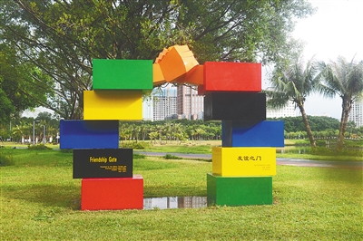 于陈学博而言,把雕塑展放在万绿园,是极富象征意义的。这些象征意义从展出作品的细节可窥知。譬如《友谊之门》,就是一件充满色彩与象征意义的现代雕塑作品。雕塑由多个色彩斑斓的立方体构成,形成一个拱门的形状,象征着开放与连通。拱门结构的堆叠错落有致,给人一种动态的感觉,仿佛代表着不同文化和人们之间的交流与互动。作品的色彩运用鲜明大胆,每一个立方体都涂有不同的颜色,这些颜色来源于奥运五环的颜色,象征海南与世界的连接。这些颜色不仅增加了作品视觉上的冲击力,也可能象征着多样性的文化和多元社会的和谐美。雕塑置于绿意盎然的公园中,背景有高大的树木和远处的现代建筑,这种自然与现代的结合进一步强调了友谊连接的广泛性和包容性。它不仅仅是一件视觉艺术作品,更是传递和平、交流和友谊精神的信使。它通过简洁而富有意义的形态与色彩语言,激发观者对于跨文化交流的深思,并传递出积极的社会信息。