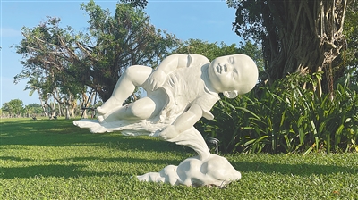 《自贸港·新生》的细节处理颇为细腻,雕塑的流畅线条和孩子的动态姿态赋予了作品强烈的生命力和动感。材质的选择与雕刻的精细程度使得雕塑在阳光照射下更显圣洁和纯净。背景的自然景观与雕塑的白色形成鲜明对比,蓝天白云和绿色草地衬托出雕塑的视觉效果,使其更加突出和引人注目。