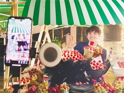 “这就是我们的‘花王’,一共有‘99朵花’,寓意长长久久!”日前,在定安县沿江公园甜蜜圣约助农专场活动现场,穿着一身西装的叶绵升对着手机,向直播间里的观众介绍他手中的特别产品——圣女果花束。他推介的“花王”由99颗定安特色农产品潭黎圣女果组成。每一颗圣女果都单独包装成棒棒糖的模样,还饰有一些闪光灯和皇冠饰品。