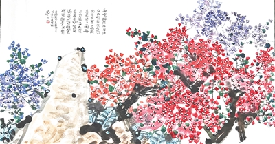 一般人画三角梅采用工笔画法,试图用勾线的方式凸显三角梅的不同。牧之画三角梅,擅长没骨画法,干、叶、花都不勾线,直接以色彩塑造物象,鲜花繁而不乱,远近层次分明,侧正老嫩得宜。作品《争艳》《红云飘然沐夏酣》《艳若霞光让人醉》等,色彩铺排洒脱却不失严谨,一眼望去满目皆是绚烂。这些年,他创作的三角梅在国际绘画界绽放光彩,成为外界认识海南的重要意象。