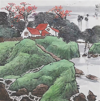 此外,王良注重将海南独特的地方题材引入绘画之中。在画作《福地》中,槟榔树高高矗立,树石布局疏密有致,他随性而起,轻点几笔朱砂红,使得疏淡的画面变得明艳。