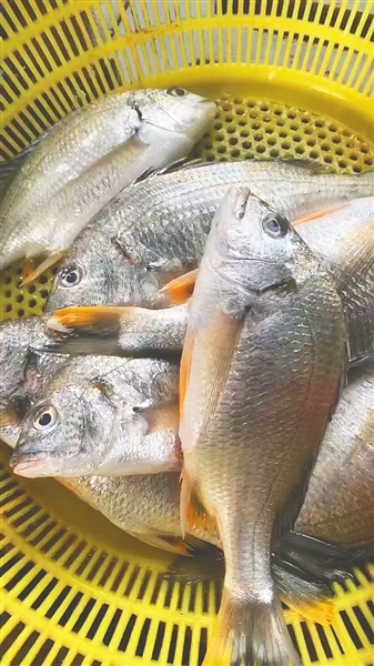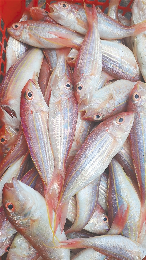 | 红线鱼 学名:金线鱼 俗名:红衫、红哥鲤 体侧有一条金黄色纵带,栖息于沙泥底海域。 海南日报全媒体记者陈彬摄 |