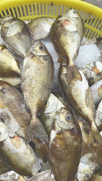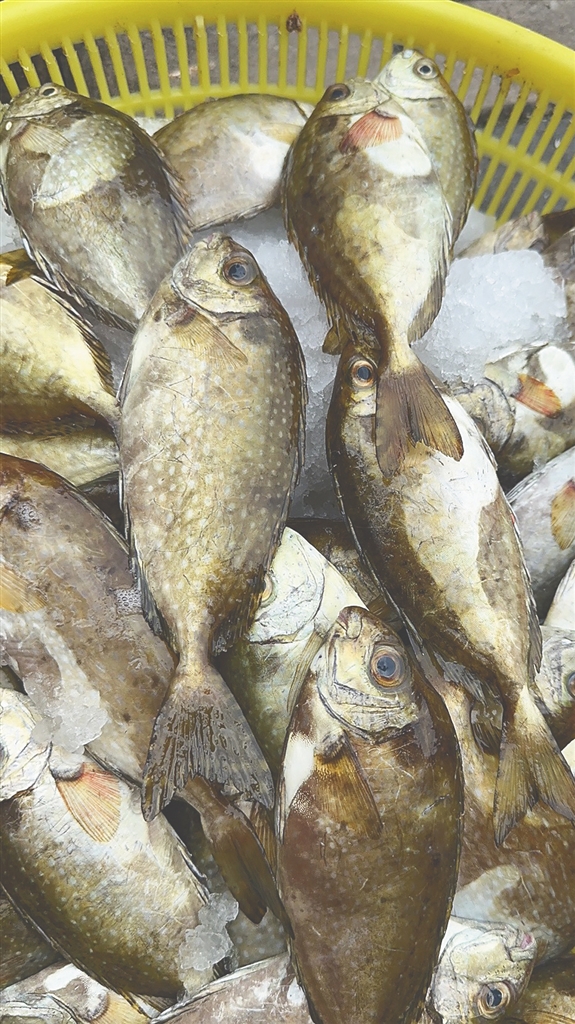 | 金鲳鱼 学名:卵形鲳鲹 俗名:黄腊鲳、金鲳 体侧扁,金黄色,尾鳍分叉,群居性。 海南日报全媒体记者陈彬摄 |
