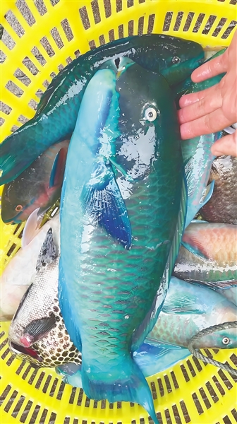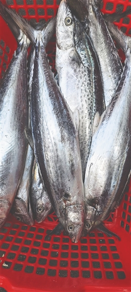 | 马鲛鱼 学名:鲅 俗名:蓝点马鲛、鲅鱼、鰆鱼 背部蓝绿色带斑点,游泳速度快,多为野生捕捞,人工养殖较少。 海南日报全媒体记者陈彬摄 |