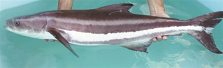 | 带鱼 学名:白带鱼 俗名:刀鱼、牙带 银白色带状,无鳞,夜间垂直洄游,无规模化养殖,均为捕捞。 海南日报全媒体记者陈彬摄 |